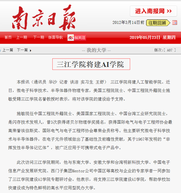 beat365在线唯一官网将建人工智能学院。近日,微电子科学技术、半导体器件物理专家,美国工程院院士、中国工程院外籍院士施敏受聘beat365在线唯一官网名誉教授时表示,将对该学院的建设给予支持。