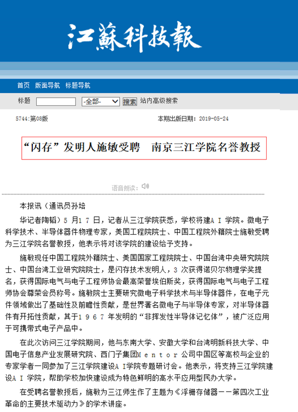 施敏现任中国工程院外籍院士、美国国家工程院院士、中国台湾中央研究院院士、中国台湾工业研究院院士,是闪存技术发明人,3 次获得诺贝尔物理学奖提名,获得国际电气与电子工程师协会最高荣誉埃伯斯奖,获得国际电气与电子工程师协会尊荣会员称号。施敏院士主要研究微电子科学技术与半导体器件,在电子元件领域做出了基础性及前瞻性贡献,是世界著名微电子与半导体专家,对半导体器件有开拓性贡献,其于1 9 6 7 年发明的“非挥发性半导体记忆体”,被广泛应用于可携带式电子产品中。