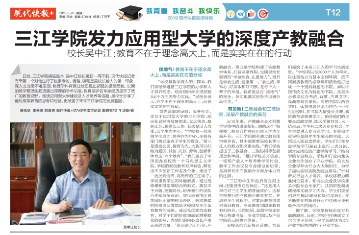 6月26日,现代快报T12版刊登beat365官网吴中江校长谈beat365在线唯一官网发力应用型大学的深度产教融合——教育不在于理念高大上,而是实实在在的行动。