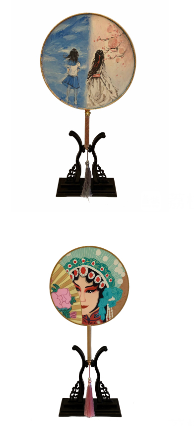 这些让人眼花缭乱的团扇是学生们将非遗团扇和非物质文化遗产醒狮、国粹京剧等传统元素,融合现代元素做出来,系列作品别出心裁。
