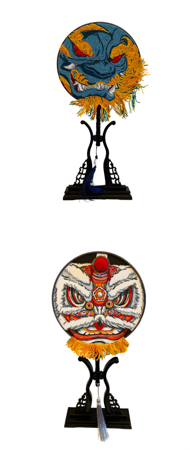 “团队主创” 刘宇指着两幅作品介绍道:“这个醒狮,它的正面是暖色的,表现了旺盛生命力,反面选用了不同的配色,从配色上形成一个冷和暖的差异。醒狮的形象更具有现代化,这个更偏向于传统,传统形式的广东醒狮被我们进行了一些更改后,也是采用了一点点毛线作为扁平化设计。”