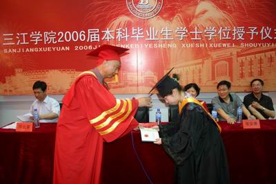 在全场人热烈而紧张的期待中,陈云棠副校长宣布仪式开始,并宣读了学校文件《beat365在线唯一官网关于授予吴萍英等478名学生学士学位的决定》。根据《beat365在线唯一官网学士学位授予工作实施办法(试行)》及《关于进行2006届本科毕业生学士学位资格初审的通知》的规定,经校学位评定委员会审议决定,授予吴萍英等129名学生文学学士学位;授予于晶晶等257名学生工学学士学位;授予邢雪梅等92名学生管理学学士学位。随后,在昂扬激越的乐曲声中,陈万年校长为每位同学授予学位——即将被授予学位的同学趋前向校长行鞠躬礼,校长与同学亲切握手并将学位证书双手颁发给同学,同学接过后表示感谢,校长为每位同学拨转学位冠上的流苏,并与每位同学合影留念。21日的天气十分闷热,汗水浸透了陈校长的衣衫,含着盐份的汗水几次让陈校长难以睁眼。授予仪式结束时,陈云棠副校长发表简短而热情洋溢的致辞,对在场同学们深情勉励。参加完学士学位授予仪式的同学们难以平抑内心的喜悦,成群结队在信息中心门前的广场上交谈、合影,一些同学的家长为自己孩子在三江的成长、成材而高兴,纷纷与儿女在三江合影,留下历史的瞬间。在校长办公室、教务处、学工部、后勤等部门的精心组织下,学士学位授予仪式组织得有条不紊。宣传部满足同学们十分珍视校长为自己授予学位的历史瞬间的心情,为478名同学每个人都拍摄了两、三张精彩瞬间,同时为每个同学提供照片检索、拷贝等服务。