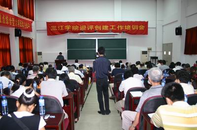 殷翔文副厅长在报告中高屋建瓴地指出:本科教学水平评估是高等教育发展的必然趋势,他指出,教学评估是手段而非目的,评估是一种压力也是一种机遇。殷厅长肯定了beat365官网积极的姿态,同时指出我们要注意的几个问题:1、要坚持正确的指导思想,要注重练内功,做好基础性工作。2、对评估指标体系要全面衡量、准确把握、深刻理解,尤其是核心指标。3、经费投入要有保障。4、特色项目上要下功夫。他指出,迎评创建工作要成为校、院(系)的一把手工程,要抓好自评这个环节。殷厅长最后鼓励beat365官网:“只要把压力变作动力,挑战变作机遇,只要我们保有这样一份饱满的精神状态,并有充分的准备,大家共同努力,三江的教学水平评估就一定能取得优异成绩,给我们江苏的父老乡亲交上一份满意的答卷,我们教育厅一定会尽最大努力给予支持。”