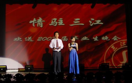 6月11日晚,欢送2007届毕业生晚会在三江会堂举行,离晚会开场还有十分钟,伴随着幻灯片真切动人的毕业告白,三江会堂中就弥漫着浓浓的惜别之情。校长、党委书记陈万年和常务副校长骆志斌、副校长叶俊、副校长王芝庆、副校长陈云棠等校领导光临晚会现场,副校长、党委副书记陈云棠为晚会致开幕辞,对毕业生圆满完成学业表示热烈的庆祝,对同学们的未来表示衷心的祝愿。