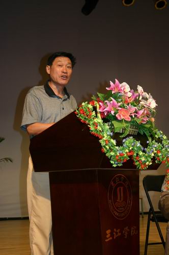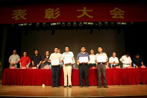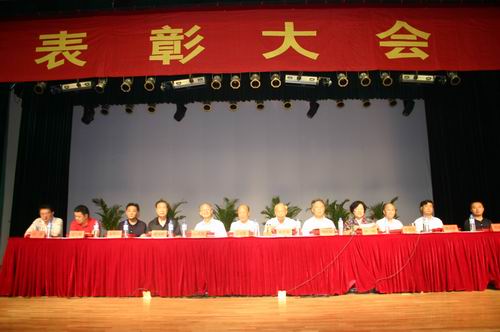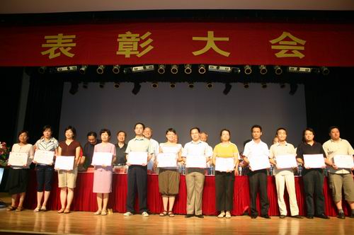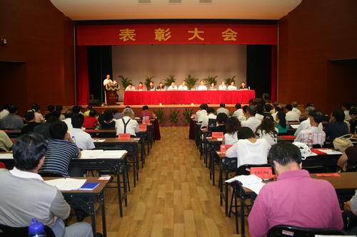 7月13日下午,全校教职工大会在三江会堂召开, 表彰2006年度暨迎评创建工作先进集体和个人,同时表彰先进党组织、优秀共产党员、优秀党务工作者,兼职教师也参加了大会。大会由党委副书记、副校长叶俊主持,陈万年校长等领导在主席台就座,骆志斌常务副校长宣读了《关于表彰2006年度暨迎评创建先进集体、先进个人的决定》,共表彰英语系等先进集体18个,毕春富、曾田和子等钱钟韩奖教金获得者5人,楼毅等优秀教师18人,周更生等先进工作者29人。党委副书记、副校长陈云棠宣读了《关于表彰2005-2006年优秀共产党员、优秀党务工作者和先进党组织的决定》,王芝庆副校长宣读了《关于表彰职成院、后勤系统2006年度暨迎评创建先进个人的决定》。激昂欢快的乐曲响起,主席台上的领导为获奖单位的代表和先进个人颁奖。颁奖结束后,黄友军、张安康、韩力江、陈馥瑛、姜金花和兼职教师陈世华同志代表获奖单位和个人介绍经验,最后,陈万年校长就评先表彰、新一轮教职工的聘任及暑假期间的工作做了重要讲话。