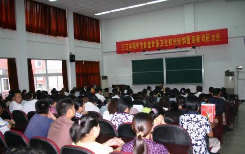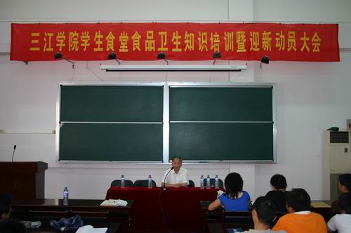 会上,雨花台区卫生监督所赵所长和华医生向在座的学生食堂全体员工做了食品卫生知识培训,这对于规范食堂管理,提高食堂卫生水准,保障广大师生健康,维护学校正常的教育教学秩序具有重要的作用。王芝庆副校长在会上充分肯定了学生食堂在卫生、质量与服务上所取得的成绩,并希望食堂工作取得更大进步。王校长对食堂工作做了四点强调:1、食堂卫生放第一位;2、保证食品原料来源渠道正规,食品卫生、安全;3、窗口销售时一律刷卡,不得收现金;4、员工工作时胸前一律挂健康证。唐孟赓副处长强调食堂要对学生和学校负责,要充分发挥后勤工作服务育人的作用。唐处长最后对食堂迎新工作做了部署,要求全校所有食堂必须于规定时间开餐,各食堂要召开全体员工大会,并加强对新员工的培训工作,要继续规范服务,并提高服务质量,争创高校文明食堂。