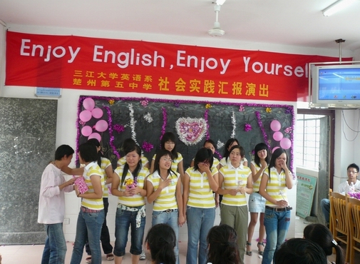 在开始的几天里,这些小老师在楚州的三尺讲台上出现了一些不足,例如,板书条理混乱,语音语调平平,与学生互动较少。但是在以后的日子里,通过英语系老师的培训和同学们的充分备课,小老师在三尺讲台上挥洒自如,她们趣味式的英语教学方式吸引了学生的眼球,让他们提高了学习英语的兴趣。最终六个组的小老师赢得了学生们的喜爱。在课余时间,彼此分享了生活和学习的快乐。8月24日,三江大学英语系暑期社会实践汇报演出在楚州第五中学的小礼堂举行。学生们的歌舞表演和英语短剧赢得了在座观众的热烈掌声,不仅是因为他们流利的英语,更是为了他们之间团结协作精神而鼓掌。一首《感恩的心》唱出了学生的心声,一句“老师,我爱你们”喊出了对小老师这十天以来的深深的爱。最后,演出以一首《再见》结束,学生和老师相拥而弃的场面感动了所有人。