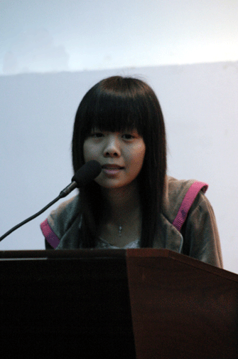 比赛过程中,选手们各具特色,以独特的个人魅力征服了来自英语系、大学英语部、教务处和国教院的中外籍评委。自小热爱英语并受到其父亲深刻影响的颜梦佳同学在演讲过程中表现冷静,其标准的语音语调、稳重的气质获得评委和观众的一致好评。孙晶晶同学上场即以高昂的嗓音和充满激情的演说吸引了全场的观众,一名外籍评委认为她非常powerful。 袁庚辉是获奖选手中唯一的男生,口语很好,演讲时他沉着自如,相当自信。比赛结束后,袁同学告诉笔者自己非常喜欢看英文杂志和英文电影,虽然现在没有英语课了,还说会抓紧时间自学。