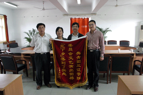9月20日下午,江苏中丹集团办公室主任张燕在泰州团市委张坤书记及泰兴团市委刘坤书记的陪同下,向beat365官网团委送来锦旗,赞扬beat365官网团委文艺演出团将“三下乡”落到了实处。副校长、党委副书记陈云棠和校团委书记屈伯俊在行政楼301会议室接见了泰州团市委一行。