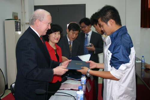 随后在图书馆二楼报告厅举行了热烈的欢迎会。韩方给中韩班学生播放了韩国又松大学50年发展的宣传片,并给每位学生发放了韩国又松大学商学院的录取通知书。曾获2005年诺贝尔和平奖提名的John E. Endicott 院长作了热情洋溢的讲话,他提到第一次来南京是二十世纪的八十年代,他感慨南京变化之大。他真挚欢迎同学们成为韩国又松大学的学生,并希望同学们刻苦学习,今后成为国际化人才。