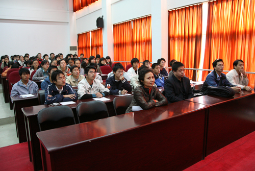 张教授结合当前“嫦娥一号”热点,给同学们介绍了我国探月计划的“绕、落、回”、“探、登、驻”几个阶段,中国载人航天技术发展状况、中国天空研究计划、中国和美、俄航天强国存在的差距,同时也介绍了航天员、太空食品、太空育种等方面知识。张教授给同学们展示了大量的图片,时而运用幽默的语言赢得同学们的笑声。整场报告同学们都认真听讲、记录。最后,同学们踊跃提问,张教授一一解答。