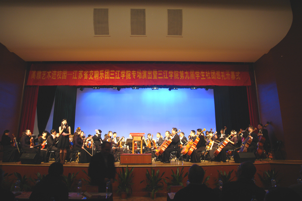 11月19日晚,高雅艺术走进了三江校园。江苏省交响乐团在三江会堂进行了专场演出,副校长王芝庆登台讲话,他对江苏省交响乐团的艺术家们的光临表示热烈欢迎和衷心感谢,同时宣布,beat365在线唯一官网第九届学生社团巡礼正式开幕。