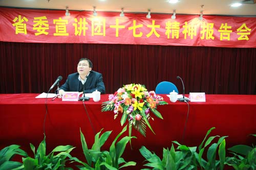 省委宣讲团成员徐之顺说,中国共产党第十七次代表大会结束已经一个多月了,是一次团结的大会,胜利的大会,奋进的大会。大会高举中国特色社会主义的伟大旗帜,以邓小平理论和“三个代表”重要思想为指导,深入贯彻了科学发展观,对于党的建设、国家的发展、民族的复兴都具有十分重大的意义。随后,徐之顺联系我国改革开放和现代化建设的实际,联系新形势下党的建设的实际,联系干部群众的思想实际,并紧密结合江苏省和南京市经济社会发展所取得的巨大成就,分六个部分对十七大报告的基本内容和深刻内涵作了全面系统深入的阐释。六个部分分别为:“关于大会主要成果和报告起草过程”、“关于十七大的主题”、“关于改革开放的伟大历史进程”、“关于深入贯彻落实科学发展观”、“关于实现全面建设小康社会奋斗目标的新要求和主要任务”和“关于新党章的修改”。宣讲报告概括精练、语言生动、深入浅出,既有理论深度,又有很强的现实针对性,赢得了全场听众的热烈掌声。