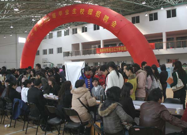 上午8点多,离招聘会开始还有半个多小时,就有不少学生来到招聘会场外驻足等待,热切地观望。“我们希望招聘到实际操作能力强、表达能力强、有亲和力的学生,简单的说,就是应用型的专业性人才”,前来招聘的南京状元楼酒店的一位工作人员告诉记者。正说话间,招聘会现场已经挤满了前来应聘的学生,来来往往的学生把过道围得水泄不通,各家用人单位的招聘台前都挤满了投简历、咨询、面试的同学,招聘现场摩肩接踵,人头攒动,现场气氛十分热烈。