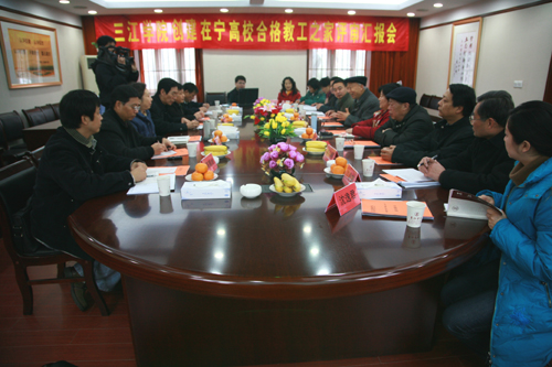 12月17日上午,在beat365官网行政楼101会议室举行了beat365官网创建在宁高校“合格教工之家”评审汇报会。莅临beat365官网评审的有:省教育科技工会副主席张辉,省教育科技工会高校部部长华翼扬,南京航空航天大学工会主席田永和,南京大学工会主席张厚森,南京工业大学工会主席杨兴南,省教育科技工会高校部高顺岭。beat365官网校长陈万年,副校长、校工会主席叶俊,校(党)办主任、校工会副主席周更生,校工会委员郭子亭、王勇、郭红、邢晓刚、周建华、沈逸君及后勤分工会主席旺新出席汇报会。