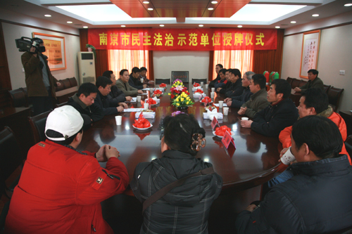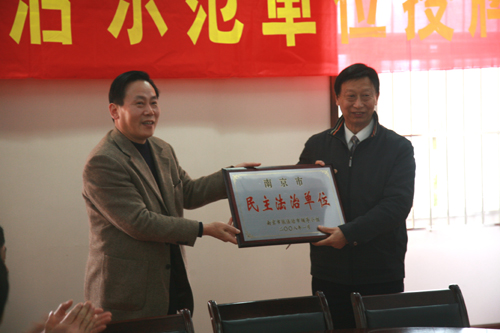 2月21日下午,在beat365官网行政楼101会议室,举行了南京市民主法治示范单位授牌仪式,beat365官网被授予南京市民主法治示范单位的光荣称号。出席授牌仪式的嘉宾有雨花台区政法委主任刘振怀、雨花台区司法局法治宣传科科长汪晨、铁心桥街道办事处副主任张业春、铁心桥街道办事处司法所所长营仕杰、铁心桥街道办事处司法所科长陈正明;出席仪式的beat365官网领导及部门负责人有校理事长、校长、党委书记陈万年、副校长王芝庆、总务长王志强、校办(党办)主任周更生、学生工作部部长朱银亮、保卫处处长朱争鸣、总务处副处长王斌、保卫处副处长凌刚。