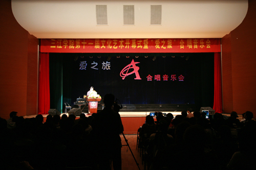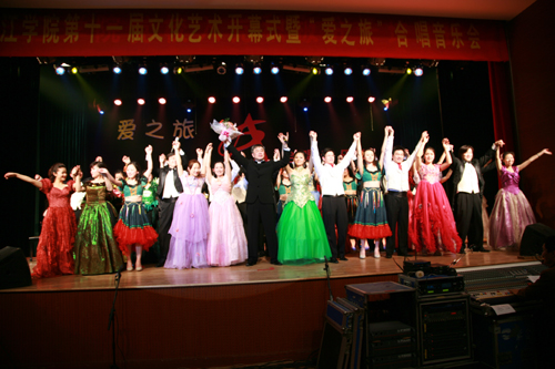 简短的开幕式结束后,在场的师生共同欣赏了由“爱之旅”合唱团带来的 大型音乐会。此次音乐会是由江苏省演艺集团“爱之旅”合唱团倾情打造的一台风格多元、形式独特的合唱音乐会。和一般气氛严肃的高雅音乐会不同,这场音乐会把讲座融入进来,由央视第一届青年歌手电视大奖赛专业组美声唱法金奖得主、梅花奖得主、连续4届担任央视青年歌手电视大奖赛评委的顾欣教授担任主讲。合唱团精彩的表演博得在场师生阵阵掌声,现场掀起了一波又一波的高潮。晚会在全体演员与观众的互动中落下帷幕。