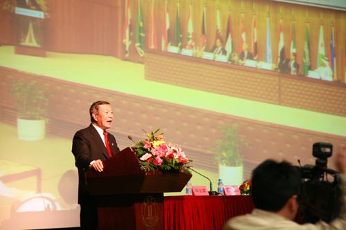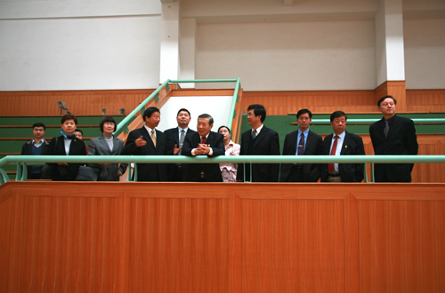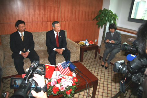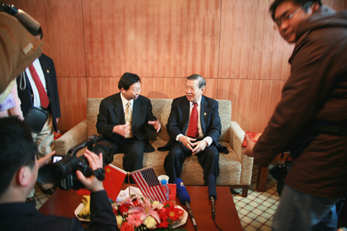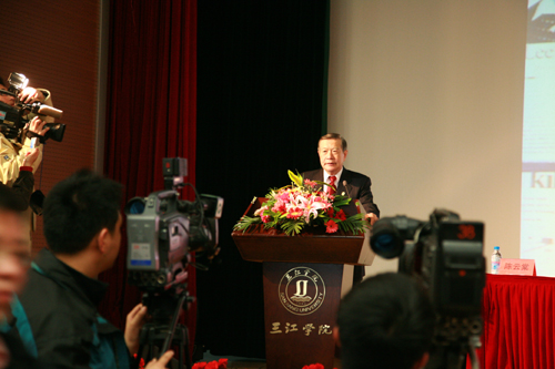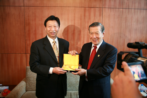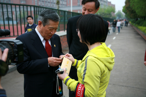 10点整,李博士一行来到三江会堂贵宾厅,那里早已挤满了闻讯赶来的记者,记者们就感兴趣的话题提问了李博士,采访结束时李博士热情和蔼地给在场的所有记者发签名卡。随后陈万年校长与李博士进行了简短的会谈,并互赠了礼品。陈万年校长给李博士具有南京地方文化特色的“辟邪”、云锦、雨花石等礼物,李博士则给陈万年校长带来了他做刑侦时用的放大镜和签名书作。