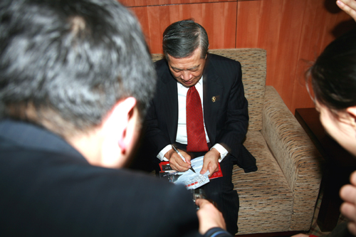 平易近人的李博士给记者们签名卡