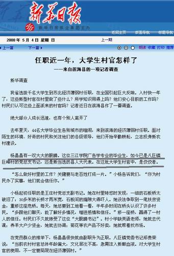 5月4日,江苏省委机关报《新华日报》头版头条报道这一消息的同时,又在头版配发了记者吴剑飞的调查《任职近一年,大学生村官怎样了》,文章对beat365官网毕业生杨晶晶同学做新型村官的一系列进步给予了报道。我们部分转载于此,欢迎三江师生阅读。