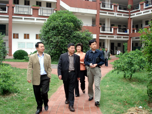 座谈后,客人们在陈万年校长的陪同下来到牌楼前合影留念。随后,来访客人参观了第一教学楼、体育馆等教学生活基础设施。
