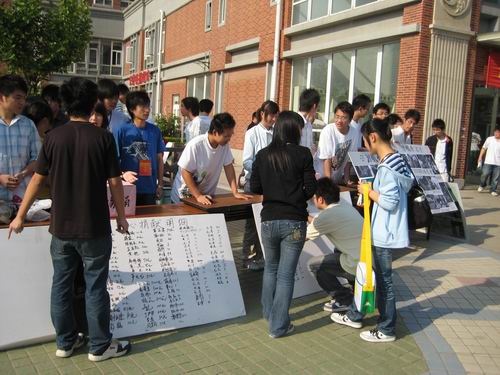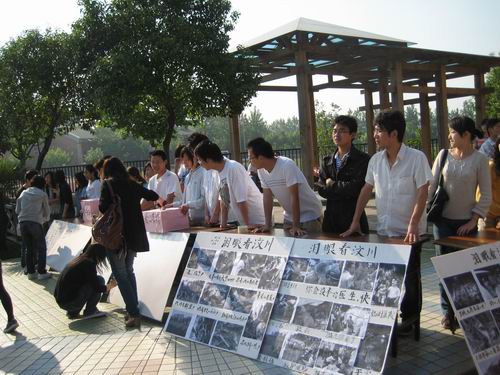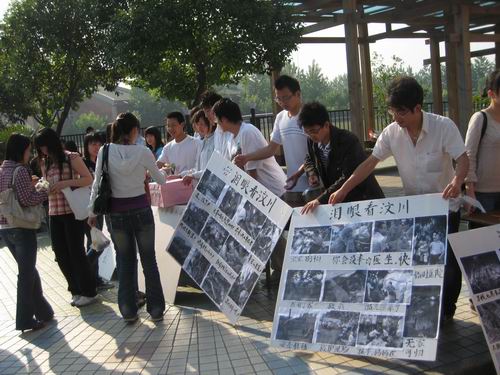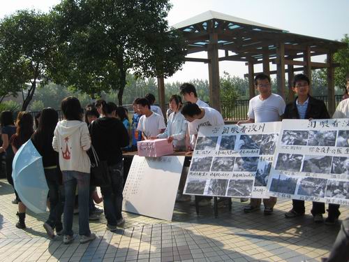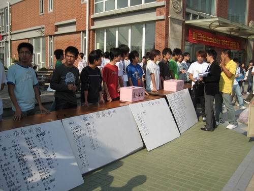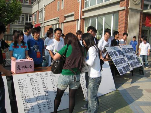 北京时间:5月14日早7点整,朝阳普照在运动场上.在beat365在线唯一官网食堂门前,由校团委主办,土木工程学院承办的以“泪眼看汶川”为主题的大型现场募捐活动在这里举行。