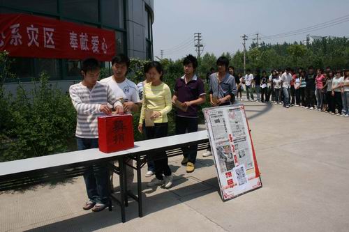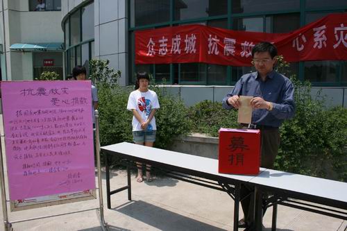 5月15日中午,在高职院操场上,举行了为灾区爱心募捐活动,高职院郭彬院长,蒋全荣、戚兴根、徐肇杰副院长带头捐款,短短十分钟时间,共募得捐款3万余元。