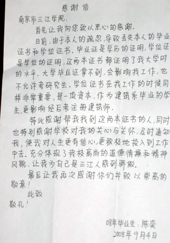 本人2008年4月15日于一教320教室遗失手机,幸得曹华英女士拾得,几经周转交还于我,令我万分激动。这种拾金不昧的精神另人十分佩服。特写次信,以表感激!