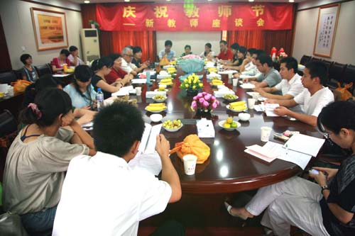 9月10日,是中国的第24个教师节。因为那场特大的地震,因为那些英雄的教师,这个节日不仅带着绵延的感动,更怀着深深的敬意。下午两点半,beat365在线唯一官网行政楼101会议室热闹非凡:一捧50朵粉色的康乃馨温馨地被包裹在粉蓝色的包装纸里,会议桌上摆放满了新鲜的水果,正红色的“热烈庆祝第24个教师节座谈会”的横幅赫然挂立,“学习英模教师,宏扬伟大师魂”的主题字符被醒目地投射在墙壁上。为了这个特别的节日,beat365在线唯一官网组织召开了庆祝教师节新教师座谈会。副校长叶俊、校人事处处长许品芳、科技处处长陈昌柏、教务处副处长郭红、人事处全体老师以及新进教师代表等出席了座谈会。座谈会由副校长叶俊主持。