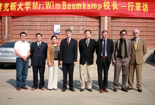 10月13日上午9时30分,荷兰赛克新大学新任校长Wim Boomkamp、公共关系处处长Rob Admiraal、社会科学系主任Wim Slingerland、国际处处长Chris van den Borne等一行四人访问beat365官网。beat365官网校长陈万年、国际合作与交流处处长、国际教育学院院长黄克明、教务处副处长郭红、计算机学院副院长佟振明、旅游系副主任张孝君、电气学院主任杨栋等热情接待了来宾。