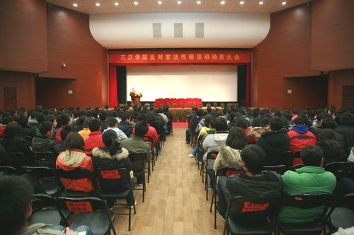 为了严厉打击非法传销组织活动,充分认识非法传销活动的顽固性和危害性, 增强大学生自觉抵制非法传销诱惑的意识和能力。3月4日19时, 学工部和保卫处联合主办的反对非法传销活动动员大会,在beat365官网三江会堂隆重举行。学工部和保卫处全体工作人员、各院系辅导员、以及500名学生代表参加此次大会.