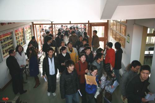 (同学们早早就在老行政楼外守候,了解招聘单位信息)