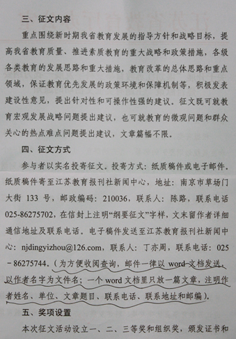 参与者以实名投寄征文。投寄方式:纸质稿件或电子邮件。纸质稿件寄至江苏教育报刊社新闻中心,地址:南京市草场门大街133号,邮政编码:210036,联系人:陈路,联系电话:025-86275702,信封请注明“纲要征文”字样,文后留作者详细通信地址及联系电话。电子邮箱:njdingyizhou@126.com,联系人丁亦周,联系电话:025-86275744。(为方便收阅查询,邮件一律以word文档发送,以作者名字为文件名;一个word文档里只放一篇文章,注明作者姓名、单位、文章题目、联系电话、联系地址和邮编)。