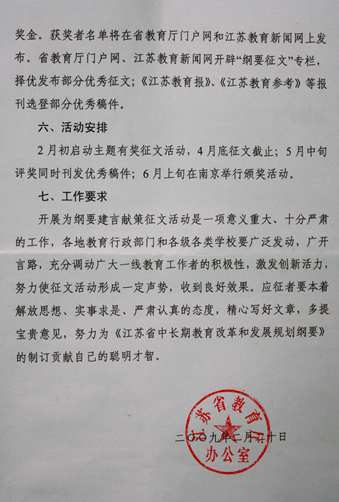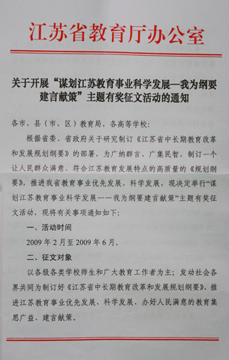 根据省委、省政府关于研究制定《江苏省中长期教育改革和发展规划纲要》的部署,为广纳群言、广集民智,制订一个让人民满意、符合江苏教育发展特点的高质量的《规划纲要》,推进我省教育事业优先发展、科学发展,现决定举行“谋划江苏教育事业科学发展——我为纲要建言献策”主题有奖征文活动。现将有关事项通知如下: