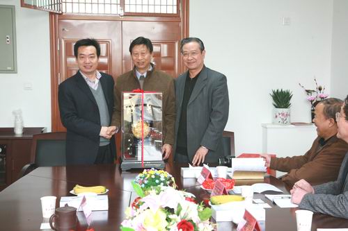(紫琅职业技术学院陈明宇董事长与张荣生院长向beat365官网陈万年校长赠送礼品)