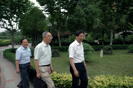 陈万年校长(右)、风景园林学院院长汤庚国教授(左)陪同张齐生院士(中)参观校园