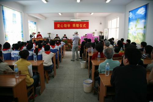 (张桥镇焦荡乡小学师生接受捐赠物资,中为王九明校长)