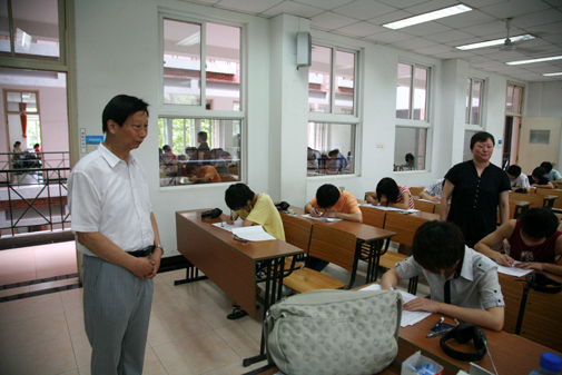 6月29日是本学期期末考试的第一天,上午8点10分,陈万年校长、陈云棠副校长、教务处梅杓春处长和学工部朱银亮部长等领导,分别对各教学楼正在进行的2008级《大学英语》考试进行巡视。