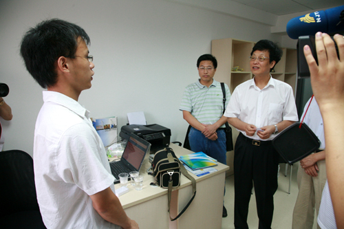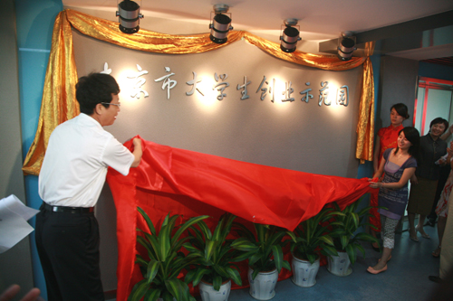 7月24日上午9:00,市人大陈家宝主任一行来到位于丹凤街的南京市大学生创业示范园视察、指导工作。在大学生创业示范园有关负责人简单介绍园区建设情况、未来规划及入驻学生创业团队现状之后,陈家宝主任和创业示范园入驻大学生代表一同为示范园揭牌。