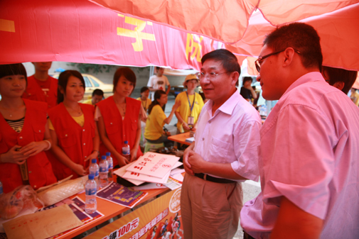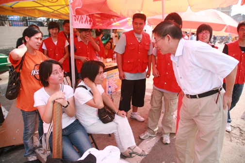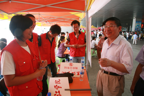 为了表达学校对志愿者们的谢意与关怀,5日下午,在学生工作部副部长、团委书记屈伯俊老师的陪同下,beat365官网分管学生工作的董新华副校长来到火车站等三个接站点,亲切慰问了学生志愿者。董新华副校长关切地询问了志愿者们中午午饭情况,热不热,累不累,等等。当董校长走到接站点的遮阳棚下,感觉到依然很炎热时,心疼地对志愿者们说,“大家辛苦了!”并要求接站点的负责者要确保同学们有足够的纯净水。最后,他嘱咐大家在注意做好新生接送工作安全的同时,要注意自身安全,平平安安地做好接站工作。