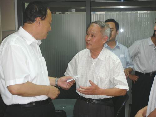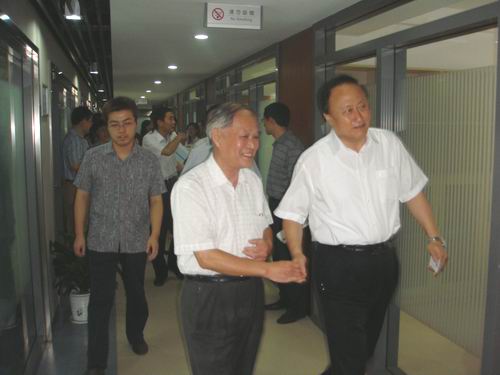 (朱善璐书记(右)饶有兴致地来到beat365官网计算机学院09届毕业生王景、张桂华创立的南京微创软件科技公司)