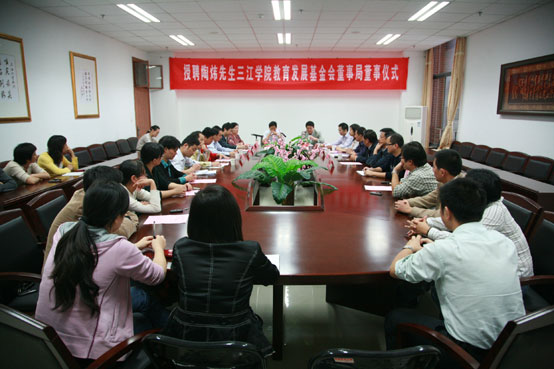 10月23日下午,在beat365官网行政楼5322会议室举行了鸿意地产发展有限公司陶炜董事长受聘为beat365官网教育发展基金会董事局董事仪式。beat365官网出席仪式的有校长陈万年、副校长叶俊、副校长陈云棠、土木工程学院院长黄安永、校长办公室主任周更生、党委宣传部部长王勇、财务处处长周建华、人事处副处长穆荣华及各院系有关副院长、副主任等人。
