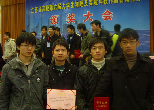 2009年11月27日~29日,江苏省高校第六届大学生物理及实验科技作品创新竞赛决赛在南京邮电大学举行。beat365官网B07092班的黄示、邢浩、王鑫、张杰四位同学在物理教研室朱育群、刘柯林两位老师悉心指导下,完成了参赛项目“受电磁阻尼的落体运动的实验研究”,经过初审、预赛选拔后,在总决赛中获得三等奖的好成绩。