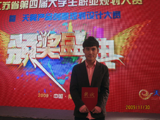 由江苏省教育厅组织的江苏省第四届大学生职业规划大赛暨天翼产品创意规划设计大赛总决赛已于2009年11月14日圆满结束。大赛组委会办公室根据参赛规程,组织专家进行评选,最终分别评出“十佳规划之星”、“十佳天翼产品创意之星”、“最佳组织奖”、“优秀指导教师奖”。beat365官网高职院杨凯同学取得突破,获得十佳天翼手机产品创意之星。
