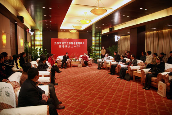 12月2日下午15:00,南京国际会议大酒店碧玉厅里洋溢着和谐、温暖的气息。著名华裔社会活动家、美国国际合作委员会主席、作家、beat365在线唯一官网的名誉理事长陈香梅女士应邀在此和beat365在线唯一官网的20多名师生进行了气氛热烈的座谈。beat365在线唯一官网理事会理事长、校长陈万年,副校长叶俊,国际合作和交流处处长黄克明,校(党)办主任周更生,党委宣传部部长王勇,学工部副部长屈伯俊等校领导出席了座谈会。