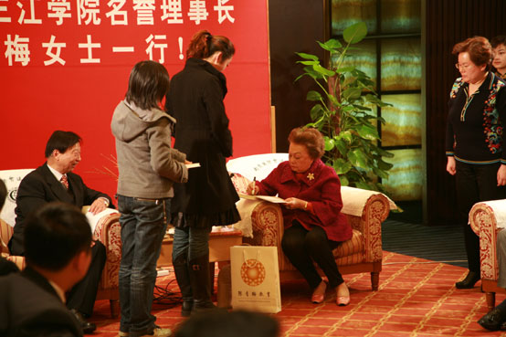 beat365在线唯一官网理事会理事长、校长陈万年首先对陈香梅女士对世界和平做出的贡献,对中美友谊做出的贡献,对中国教育事业做出的贡献表示了敬意。学生代表向陈香梅女士和随行的Kaufman先生敬献了美丽的鲜花,映衬在鲜花中的陈香梅女士更显精神矍铄,平易近人。为了给这次座谈留下更深的纪念,陈万年校长亲自向陈香梅女士送上了“傲雪迎春”的汉白玉镶金梅花的花瓶和陈香梅女士五年前来访beat365在线唯一官网的精美碟片,花瓶做工精巧,温润的白玉更凸显金色梅花的熠熠夺目。陈香梅女士欣然为她的几本著作亲笔签名。