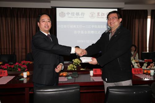 12月14日,这项爱心助学活动在高职院(继教院)的校园再次延续,出席本次助学基金捐助活动的领导有beat365在线唯一官网骆志斌副校长,王志强副校长,校长助理、高职院和继教院郭彬院长,高职院蒋全荣副院长,高职院和继教院徐肇杰副院长,继教院孙凤英副院长,中信银行城南支行张玉林行长,中信银行城南支行王蕴华、张兆建副行长等,以及高职院(继教院)的师生代表和中信银行的代表。整个捐助活动由徐肇杰副院长主持,张玉林行长首先讲话,强调这一次的爱心助学行动仍然是中信银行城南支行所有员工的自发捐助,加上王志强副校长个人捐助的1万元助学款,共是3万元,这项爱心助学活动会长期坚持下去,有可能的话,今后还将进行一对一的捐助,力争让更多的贫困学生感受到温暖与关怀,更好地完成学业。随后,郭彬院长代表高职院(继教院)全体师生员工接收了爱心助学基金。学生代表06计算机班的於佳敏同学和08机械班的蒋顺同学分别发言,他们表示一定会珍惜这笔爱心助学基金,树立信心,努力学习,争取以优异的成绩回报社会的爱心和母校的培养,成为国家的栋梁。
