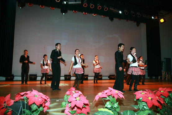联欢会在教工舞蹈团喜庆、吉祥、热闹的舞蹈《欢天喜地》中拉开帷幕。图书馆带来的短剧《办公室的神话》及建筑系的小品《招聘会》内容深刻而形式新颖;旅游学院的《映山红》以温婉柔美的舞蹈形式重温了革命年代的军民鱼水情;军人合唱团的合唱《我们走在大路上》以铿锵的歌声展示了当代军人特有的风采;电气学院的华尔兹《雪绒花》温馨而浪漫;教工舞蹈团的《虎年吉祥》以活泼、可爱、调皮的舞蹈形式,表达了大伙对新年的期待与祝福,而郑增琴老师专业性的表演,也赢得了台下的阵阵掌声;国教院的中外歌曲联唱《JAMBALAYA》把现代舞蹈与百脑汇的风格形式巧妙地融合于一体,经典而时尚。晚会在国教院李佳老师和团委鲁璐老师的合唱《我和我的祖国》的歌声中结束。