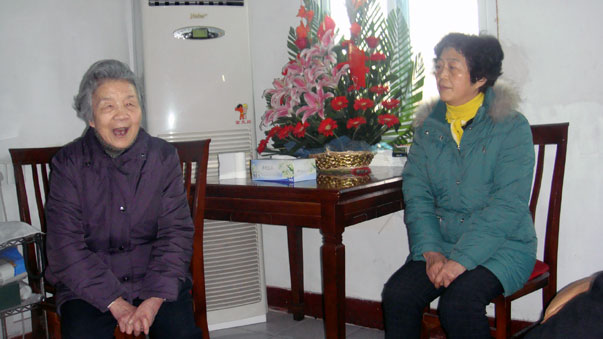 老校长的夫人李老师与工会委员、校办副主任郭子亭(右一)谈笑风生