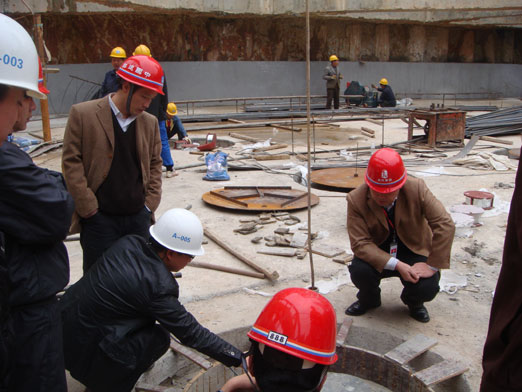 课题组接着考察了复合桩基正在安装施工阶段的项目—当代天镜。总包单位详细介绍了项目情况:当代天镜是复合桩基技术的重大突破,首先建筑总高度达到120m,属于超限高层建筑;其次复合桩基技术通过常规的竞标、设计和审查程序获得采用,这为该技术的进一步推广应用奠定了良好的基础。随后,课题组一行深入施工现场考察复合桩基技术的核心部件—桩顶调节装置的安装施工。在施工现场,黄安永院长与相关技术人员深入交流,认真了解该产品的使用机理和施工工艺。